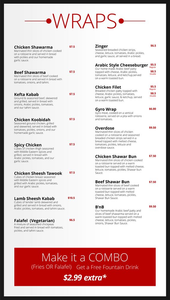 Our homemade Arabic beef patty and slices of beef shawarma served on a warm toasted bun topped with melted cheese, lettuce, tomatoes, pickles, onions, Shawar Bun Sauce.