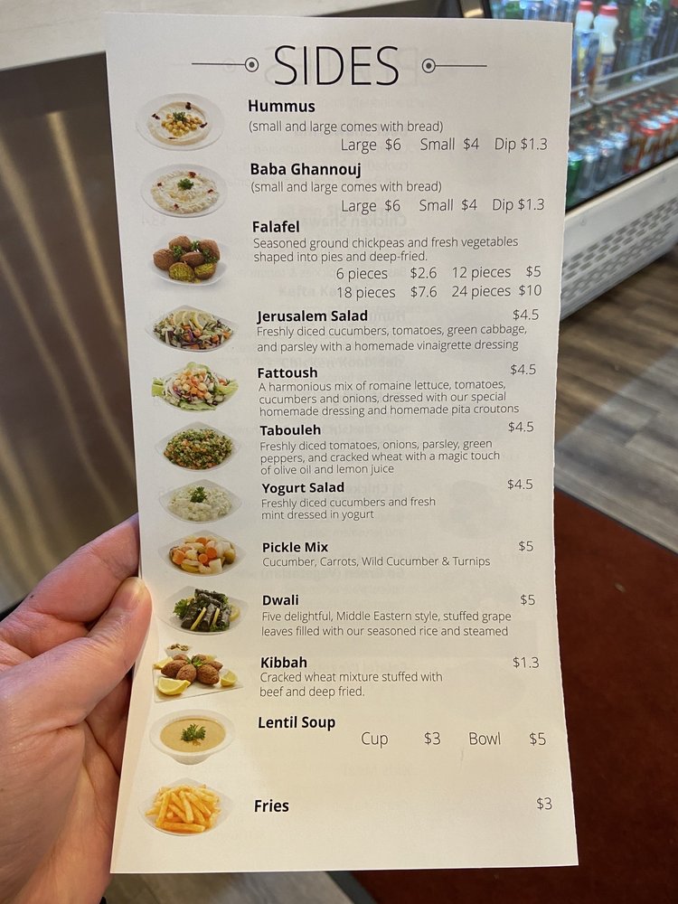 Cubes of chicken thigh seasoned with Middle Eastern spices and grilled, served in bread with Arabic pickles, tomatoes, and our garlic sauce.